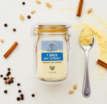 7 Spice Dry Extract combines seven of the world’s most celebrated spices into a single, concentrated blend. Each small sachet contains the essence of around seven kilograms of fresh turmeric, black pepper, ginger, cinnamon, cardamom, clove, and nutmeg, blended with natural maltose for easy use. Perfect for sprinkling over porridge, stirring into smoothies, or adding to savoury and sweet dishes, this vegan, 100% natural extract delivers aromatic warmth, rich flavour, and a practical, compact way to enjoy the traditional benefits of these spices in your daily routine.