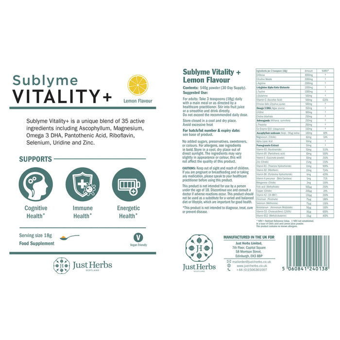 Sublyme Vitality+ Powder Lemon Flavour is a comprehensive daily food supplement designed to support cognitive health, immune function, and energy levels. This vegan-friendly powder blend contains 35 active ingredients, including amino acids, vitamins, minerals, and plant extracts, formulated to meet the nutritional needs of individuals with chronic illnesses.