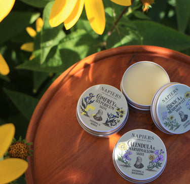 Napiers Calendula & Marshmallow Soothing Salve is a protective herbal barrier balm designed to calm, nourish and restore skin. Formulated with calendula to support repair and renewal, and marshmallow root to deeply condition and protect, this versatile salve is ideal for working hands, cracked cuticles, heels, elbows and other dry patches.