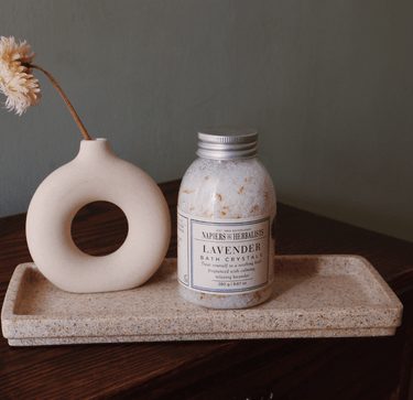 Napiers Lavender Bath Crystals combine sea salt, Epsom salt and pure lavender essential oil to create a deeply relaxing and skin-softening soak. Enhanced with lavender flowers, these crystals calm the senses, ease tension and support restful sleep. Perfect for evening use, they help relax tired muscles while leaving skin refreshed and lightly scented.