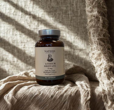 Napiers Lithium Orotate Capsules provide a gentle, highly bioavailable source of elemental lithium in a convenient one-a-day format. Each vegan capsule contains 130 mg of lithium orotate, delivering 5 mg of elemental lithium.