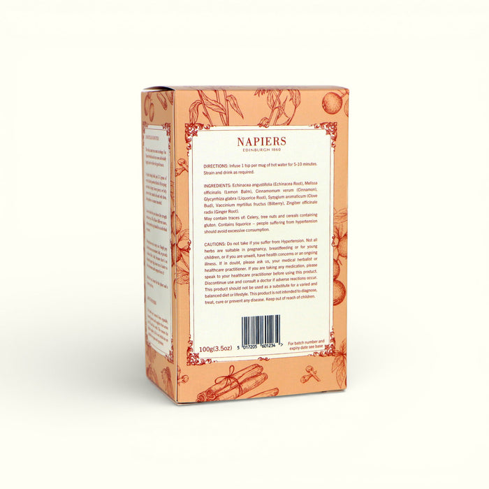 Echinacea angustifolia (Echinacea Root), Melissa officinalis (Lemon Balm), Cinnamomum verum (Cinnamon), Glycyrrhiza glabra (Liquorice Root), Syzigium aromaticum (Clove Bud), Vaccinium myrtillus fructus (Bilberry), Zingiber officinale radix (Ginger Root). May contain traces of: Celery, Tree nuts and cereals containing gluten. Contains liquorice - people suffering from hypertension should avoid excessive consumption.