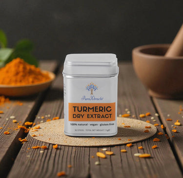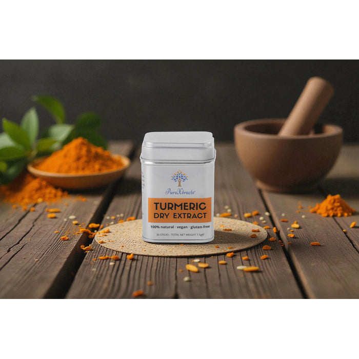 Experience the power of pure turmeric with our Turmeric Dry Extracts Daily Balance Tin. Each single-serve sachet delivers a concentrated boost of premium South Indian turmeric, crafted through a unique extraction method that preserves high levels of bioactive compounds for maximum absorption and flavour. Perfect for adding to drinks or food, these vegan, 100% natural stick packs offer a simple, travel-friendly way to support daily wellbeing through one of nature’s most celebrated spices. Ideal for those seeking purity, convenience, and a naturally balanced lifestyle.