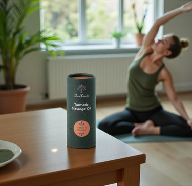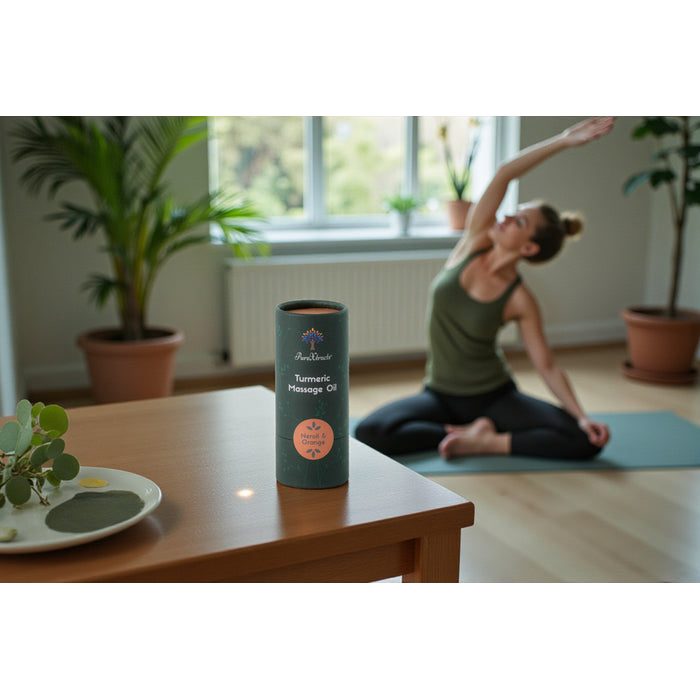 The Turmeric Massage Oil is a warming, uplifting body oil designed to ease tension and restore balance after a long day. Inspired by traditional Ayurvedic practice, this 100% natural blend combines turmeric root oil, cold-pressed sesame oil, and pure Neroli and Orange essential oils. It supports relaxation, comfort, and circulation while leaving the skin deeply nourished and softly scented. Ideal for muscle recovery, post-workout care, or evening self-massage, this vegan-friendly formula offers a luxurious spa-like experience at home.